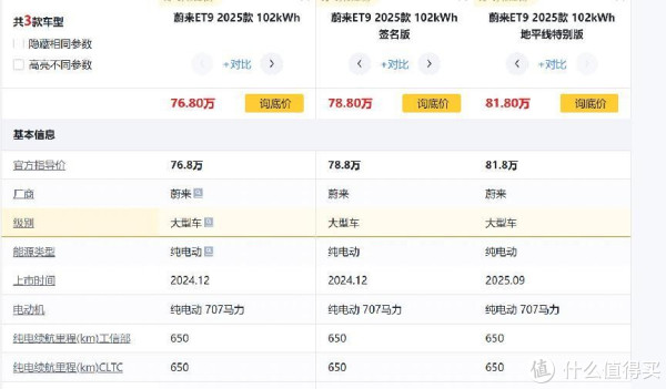 目前,蔚来ET9共有三款不同配置的版本在售,官方指导价区间为76.80万至81.80万元。相较于BBA系列的同级别车型,整体性价比还是不错的。接下来,我们以官方指导价为76.8万元的蔚来ET9 2025款 102 KWH车型为代表,详细了解这款车在各方面的性能表现,也为大家购车提供一些参考。