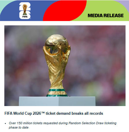 据悉,美加墨世界杯分组于本月初揭晓后,最新一轮门票抽签登记于12月11日开始,将持续到明年1月13日。
